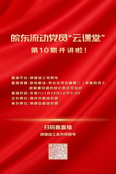 本期流动党员“云课堂”将由滁州市琅琊区皖东先锋讲师、安徽亭城律师事务所党支部书记郑忠琴带来“新规解读:劳动法司法解释二|老板和员工都需要知道的核心变化与应对”。诚邀您的参与,精彩内容,敬请期待!